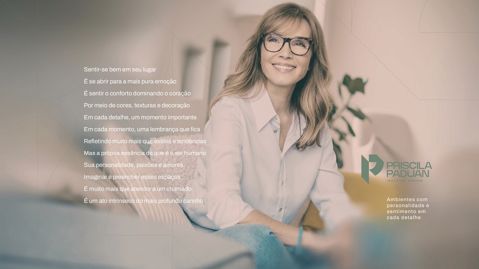 Para criar a identidade visual da designer de interiores Priscila Paduan, tivemos como desafio transformar em elementos visuais as suas habilidades como pessoa e profissional: sua versatilidade, o olhar para cada detalhe e, principalmente, o carinho e emoção que aplica em todos os seus projetos. A marca apresenta equilíbrio entre a parte técnica, representada por linhas e ângulos retos, com o lado humano, linhas suavemente arredondadas, resultando em um conjunto elegante e de muita personalidade.
